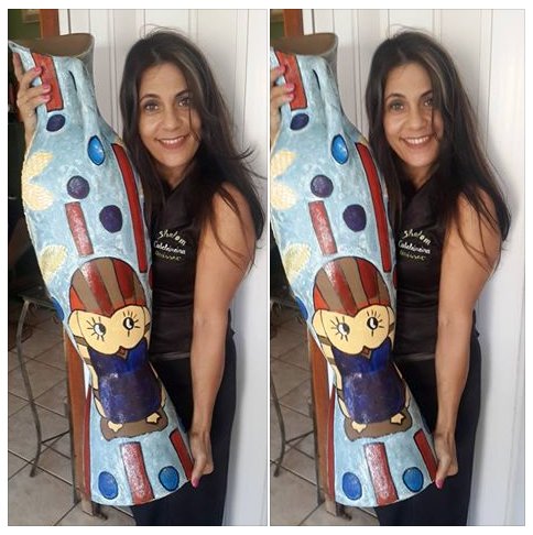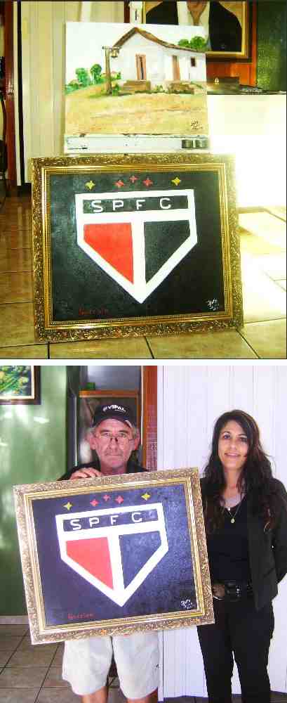 Foi então que no dia 03/05/2012 apareceu um senhor em meu estabelecimento com esse quadro. Quando vi, fiquei imensamente emocionada, pois já fazia alguns anos que eu o estava procurando “louca para tê-lo de volta”, eu perguntei onde o encontrou? Ele me respondeu:- No lixo, aí eu disse quero ele pra mim! Ele me respondeu que sempre passava em frente ao meu estabelecimento e via quadros de times de futebol pintados e então me pediu em troca o quadro do time do São Paulo pintado. E foi aí que eu imediatamente comecei a pintá-lo em uma tela de 50×60 técn. Óleo sob tela.